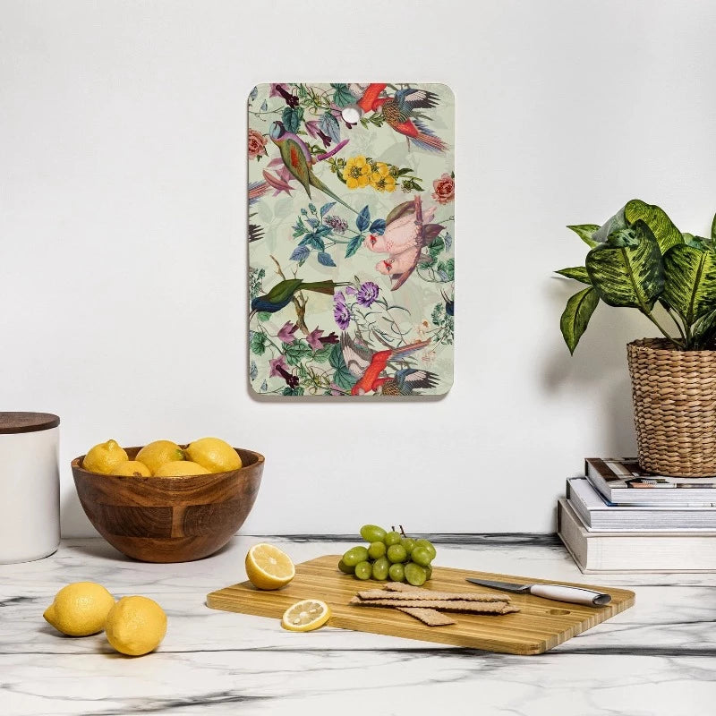 This gorgeous and unique cutting board is equal parts art and function. The art display side features colorful birds and flowers and is printed with a satin finish that will pop when displayed on your counter or hung on the wall through the 1" handle. The prep side is a eco-friendly and durable bamboo woodgrain that can be easily washed with a non-abrasive cloth. And the best part? Every purchase pays the artist who designed it—supporting creativity worldwide!