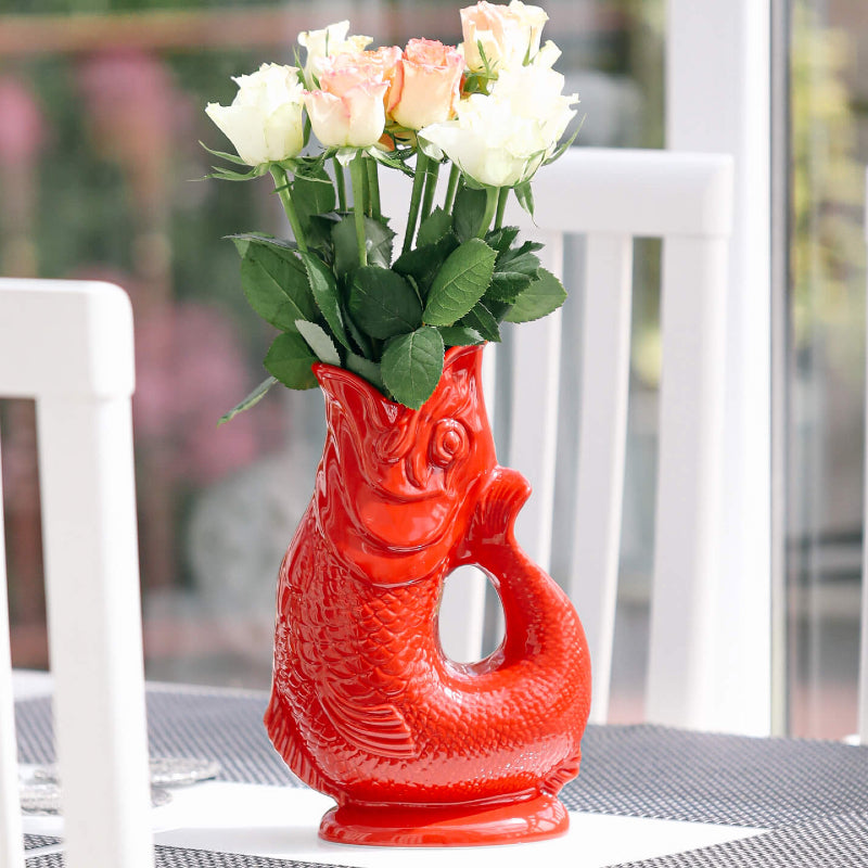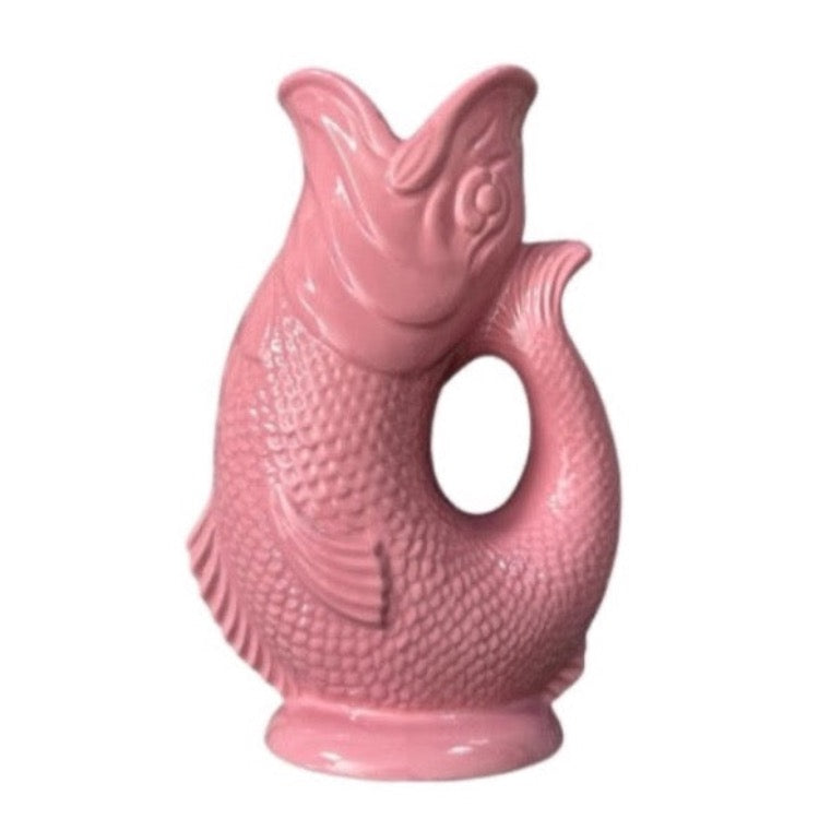 The fish pitcher is an iconic and whimsical pitcher, first created almost 150 years ago in Staffordshire and still being made there today with the original mold. Often referred to as a "glug jug" or "gluggle jug" these pitchers make a gurgling sound while poured when filled 3/4 of the way with water. The gluggle jug fish pitcher makes a wonderful gift and can be used as both a pitcher or vase.