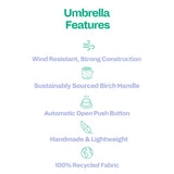Rainy days call for great umbrellas and the Original Duckhead umbrellas are not only great looking but made to last. This colorful print evokes Matisse and will brighten up any rainy day. Compact enough to fit in your bag and take anywhere. Even better, these umbrellas are sustainably made! The Matisse duckhead umbrella fabric is made from 9 recycled plastic bottles and the solid wood duckhead handle is made from sustainably sourced wood.