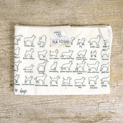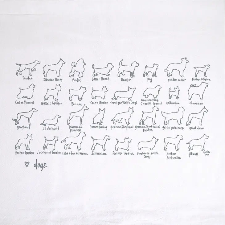 These kitchen towels are filled with dog breeds - find your favorite or discover a new one. Drawn, labeled + screen printed onto washable lint-free flour sack cotton kitchen towels. Milled + printed in the US on white cotton. Machine washable, tumble dry, iron as needed, but we don't recommend using bleach.
