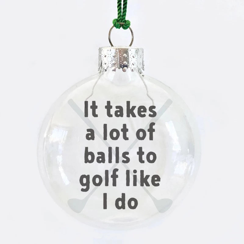 This funny golf Christmas ornament will score a hole in one in the gift giving game this holiday season.  The handblown glass golf ornament reads "It takes a lot of balls to golf like I do" and will make any golfer smile.