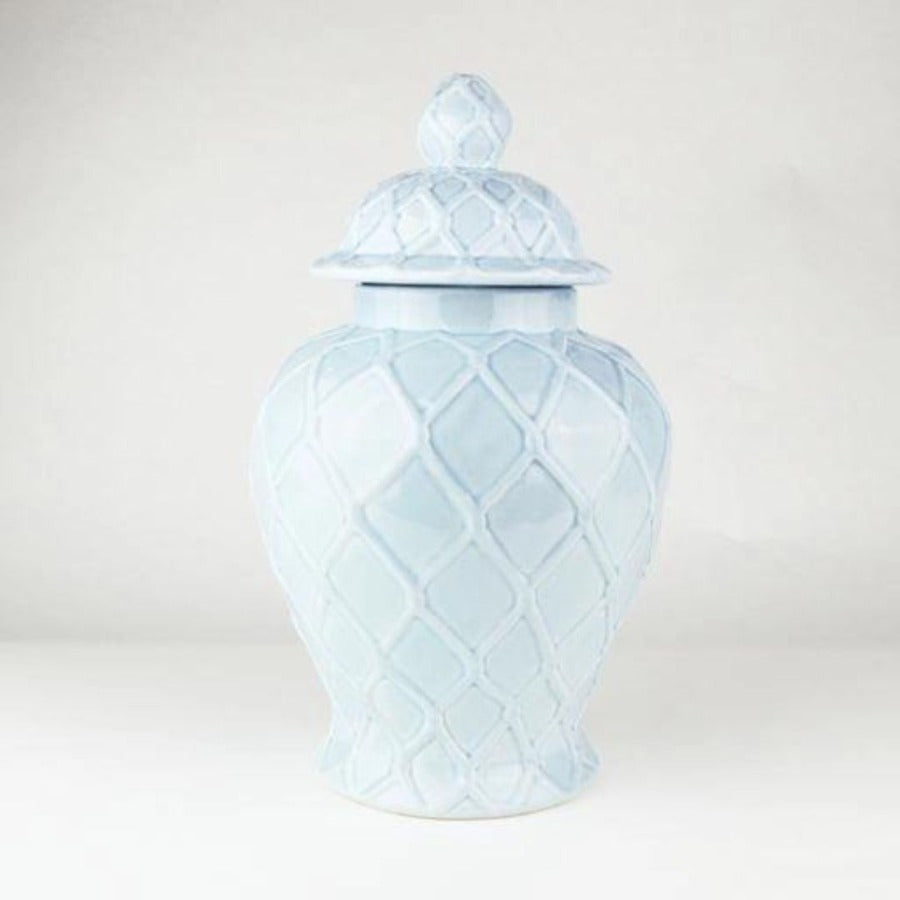 Spruce up your home decor with our Large Light Blue Textured Ginger Jar.  Its unique blue textured design and removable lid adds a playful touch to any room, while its size allows for versatile use as a decorative piece or storage container or use as a standalone piece, showing off a freshly picked bouquet of flowers . Add this charming jar to your collection today!